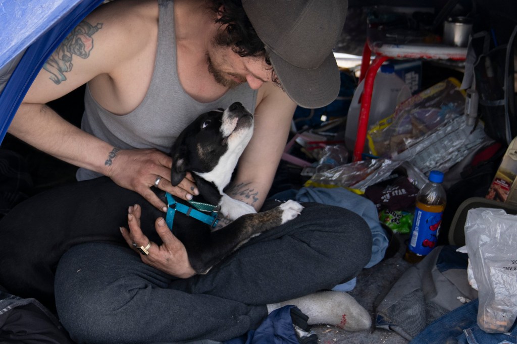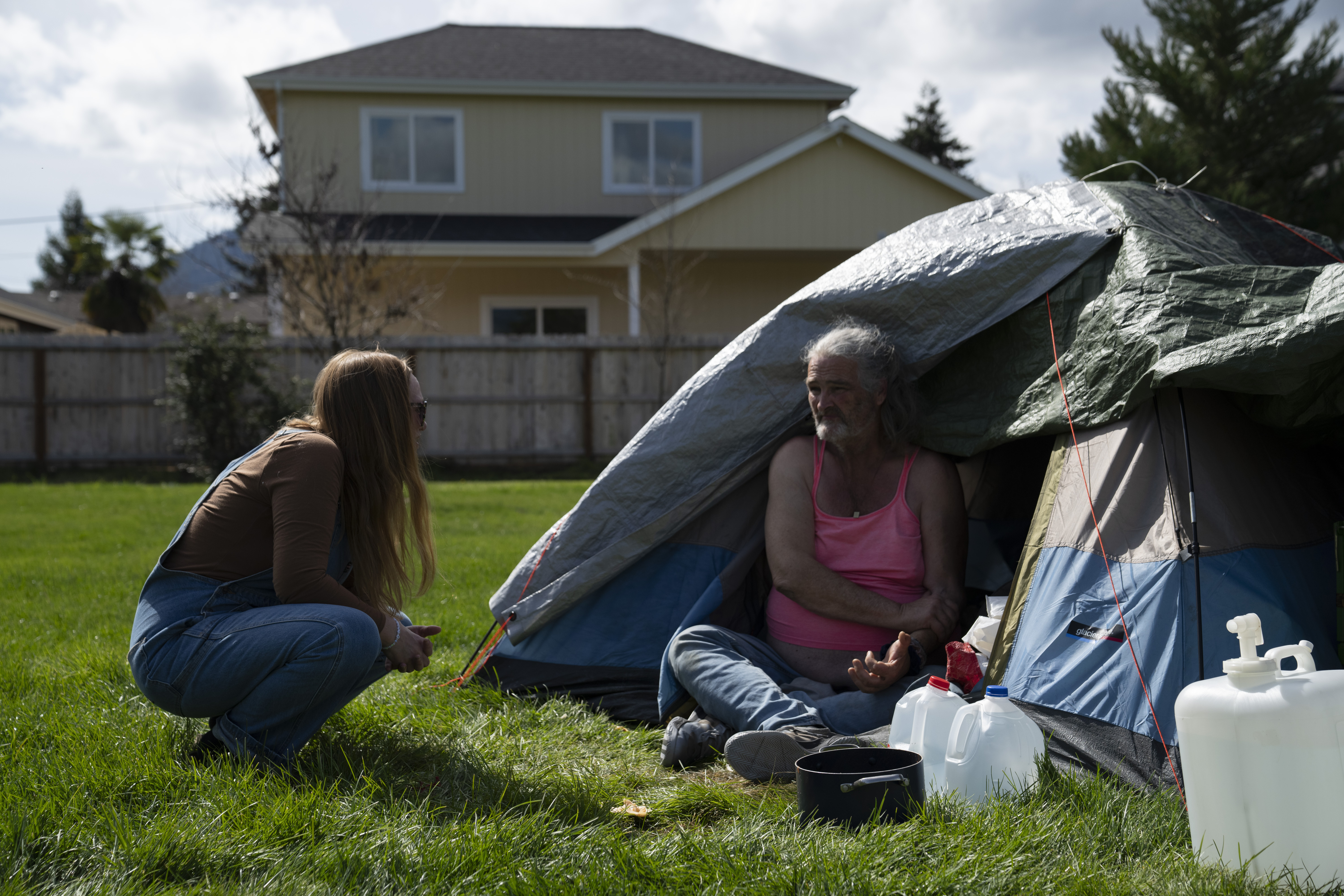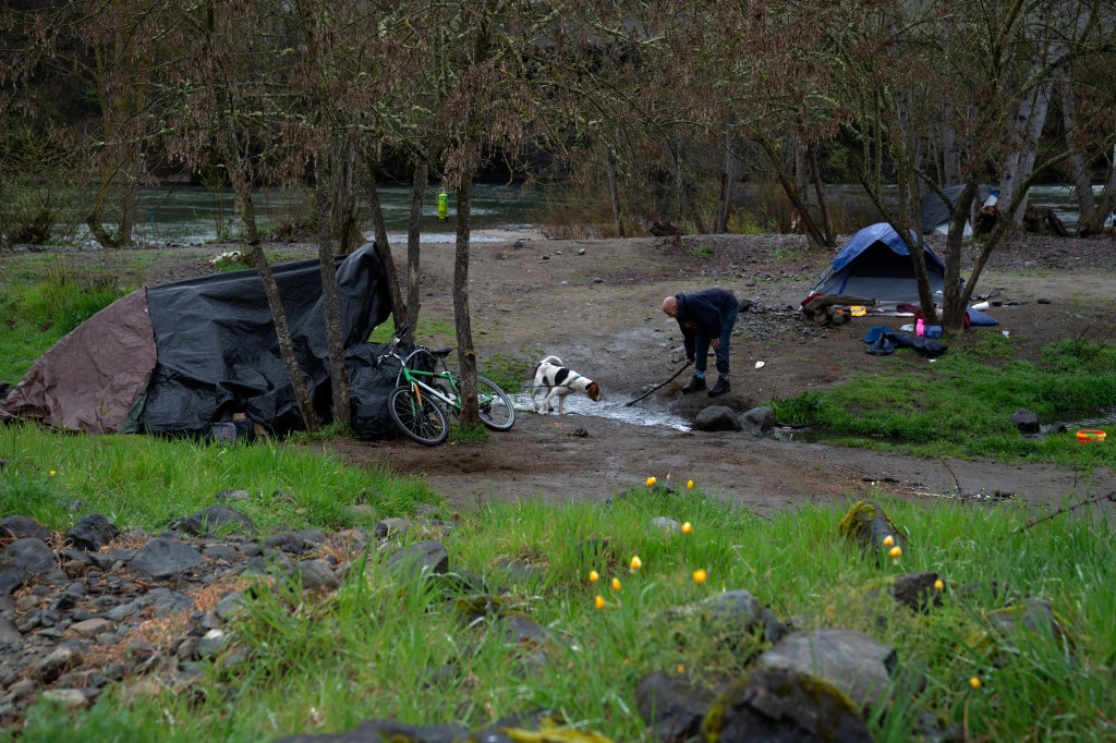 Vehicles drive down Rogue River Highway as light shines on the area March 23, 2024, in Grants Pass, Ore. (AP Photo/Jenny Kane)Cassy Leach, a nurse, who leads a group of volunteers who provide food, medical care and other basic goods to the hundreds of homeless people living in the parks, walks to help homeless people camping in Fruitdale Park move their tents on Saturday, March 23, 2024, in Grants Pass, Ore. (AP Photo/Jenny Kane)Nichole McKendrick holds her two daughters as she speaks after getting free food at Riverside Park on Thursday, March 21, 2024, in Grants Pass, Ore. McKendrick has been living out of a vehicle with her two girls. (AP Photo/Jenny Kane)A homeless child plays in the park after receiving free food with her mother and sister, in Riverside Park, March 21, 2024, in Grants Pass, Ore. On Friday, June 28, the Supreme Court ruled that cities can enforce bans on homeless people sleeping outdoors in West Coast areas where shelter space is lacking. (AP Photo/Jenny Kane)A homeless person adjusts the jacket after receiving it from another under Redwood Highway near Baker Park, Friday, March 22, 2024, in Grants Pass, Ore. The rural city of Grants Pass in southern Oregon became the unlikely face of the nation’s homelessness crisis as its case over anti-camping laws went to the U.S. Supreme Court. (AP Photo/Jenny Kane)A man plays with his dog in Baker Park next to his tent, at left, after using the stick to help the stream of water flow better on Friday, March 22, 2024, in Grants Pass, Ore. (AP Photo/Jenny Kane)Laura Gutowski tears up while speaking to the Associated Press, Saturday, March 23, 2024, at Fruidale Park in Grants Pass, Ore. Gutowski’s life was upended when her husband died from a pulmonary embolism. Suddenly, in her 50s, she found herself with no income. They didn’t have life insurance or savings, and about a month after his passing, she was sleeping outside in the city she grew up in. “I used to love camping,” she said through tears. “I loved the outdoors. And now I can’t stand it anymore.” (AP Photo/Jenny Kane)Kevin Reeves looks at his puppy while in his tent in Baker Park on Thursday, March 21, 2024, in Grants Pass, Ore. (AP Photo/Jenny Kane)A volunteer checks in with David Wilson near his tent in Riverside Park on Thursday, March 21, 2024, in Grants Pass, Ore. Wilson was among those getting free food and breakfast brought by volunteers to the park that morning. (AP Photo/Jenny Kane)Brock Spurgeon speaks during an interview with the Associated Press on Friday, March 22, 2024, in Grants Pass, Ore. Spurgeon is a member of a self-proclaimed “park watch” group. Spurgeon said the group isn’t against homeless people, but rather public drug use: One of his sons is living in the parks as he struggles with addiction, and his brother died while homeless in a nearby city. (AP Photo/Jenny Kane)A family photo rests on a chair at the home of Brock Spurgeon on Friday, March 22, 2024, in Grants Pass, Ore. Spurgeon is a member of a self-proclaimed “park watch” group. Spurgeon said the group isn’t against homeless people, but rather public drug use: One of his sons, Jack, seen at left in the photo on the chair, is living in the parks as he struggles with addiction. (AP Photo/Jenny Kane)With Fruitdale Elementary School in the background, a homeless man adjusts his shoe at Fruitdale Park, March 23, 2024, in Grants Pass, Ore. (AP Photo/Jenny Kane)Myles Baida plays pickleball after emergency responders put a homeless person in an ambulance on Saturday, March 23, 2024, in Grants Pass, Ore. Relatives had called police and requested a welfare check. (AP Photo/Jenny Kane)With Fruitdale Elementary School in the background, a Grants Pass police officer walks to check on a homeless person after relatives asked for a welfare check at Fruitdale Park on Saturday, March 23, 2024, in Grants Pass, Ore. (AP Photo/Jenny Kane)Thomas Person, a resident at the Gospel Rescue Mission, sits on their bed before dinner on Thursday, March 21, 2024, in Grants Pass, Ore. Person arrived at the shelter on March 18. (AP Photo/Jenny Kane)Cassy Leach, seated second from left next to two empty seats, watches community members react in a City Council meeting to questions about whether public comment would be heard after a veto by Grants Pass Mayor Sara Bristol on Wednesday, March 20, 2024, in Grants Pass, Ore. Leach is a nurse and volunteer who helps homeless people in Grants Pass. Some residents want to limit homeless outreach efforts parks. The City Council proposed requiring outreach groups to register with the city. (AP Photo/Jenny Kane)A teenager who was walking by stops to hold a sign as a member of the self-proclaimed “park watch” group walks to speak with them outside City Hall on Wednesday, March 20, 2024, in Grants Pass, Ore. (AP Photo/Jenny Kane)A used needle is seen next to orange syringe caps on the ground on Friday, March 22, 2024, in Baker Park in Grants Pass, Ore. (AP Photo/Jenny Kane)Brian Wright, center, prays during bible study at Gospel Rescue Mission, Thursday, March 21, 2024, in Grants Pass, Ore. (AP Photo/Jenny Kane)A resident at the Gospel Rescue Mission homeless shelter watches a report by KDRV NewsWatch 12 on the community raising money for tiny homes while eating dinner Thursday, March 21, 2024, in Grants Pass, Ore. (AP Photo/Jenny Kane)A homeless person tries to use a lighter to smoke drugs on Friday, March 22, 2024, in Grants Pass, Ore. (AP Photo/Jenny Kane)A group of teenagers watch as a homeless person rides a bike past them in Riverside Park, Friday, March 22, 2024, in Grants Pass, Ore. (AP Photo/Jenny Kane)A homeless woman walks near a park enterance towards the restrooms on Saturday, March 23, 2024, in Grants Pass, Ore. (AP Photo/Jenny Kane)With an American flag flying in the background and tents in the distance, amputee Donnie Snow, who is homeless, uses his bike to carry his dog Bubba up a hill in the rain at Riverside Park on Saturday, March 23, 2024, 